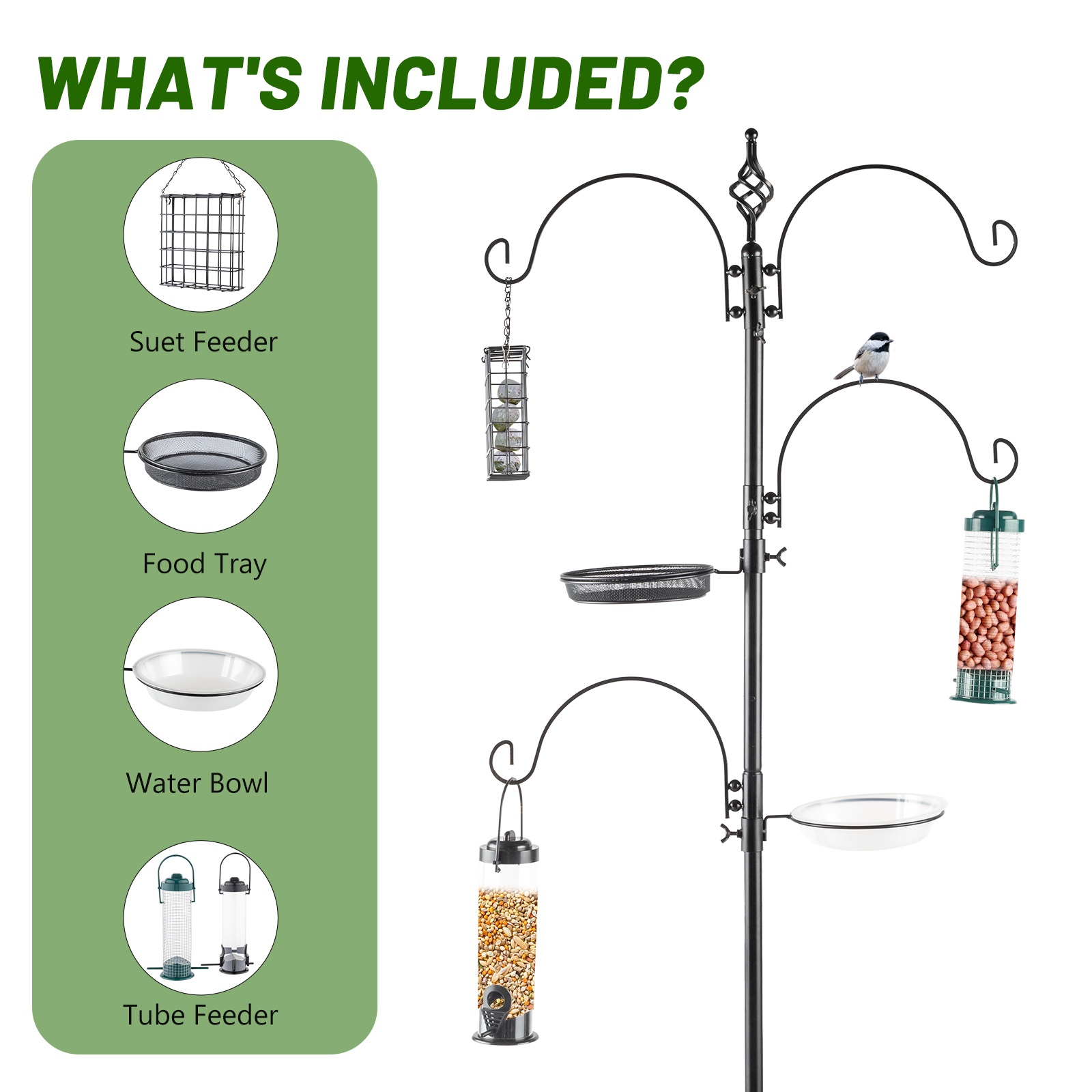 3. The top hooks are great for hopper, tube and nyjer feeders - effective in attracting smaller birds like finches, chickadees, titmice and junocs. The additional arms offers more hanging options. Suet basket attracts nuthatches, woodpeckers, parrots, wrens and starlings. The mesh tray can hold mealworms, peanuts, dried fruit or milo for ground feeding birds like cardinals, juncos, doves, robins and jays. The plastic water bowl functions as a birdbath.